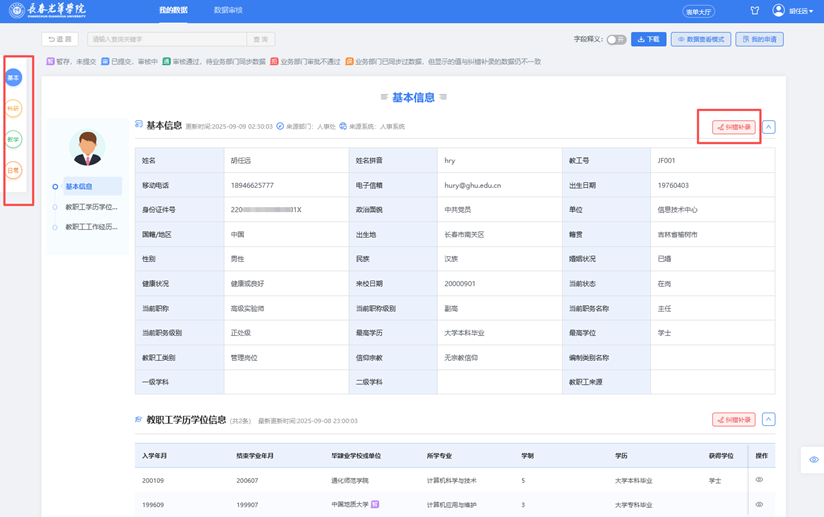 为师生建立个人数字档案,展示其在校内的各类数据,如人事数据、教学数据、科研数据、图书借阅数据等,方便师生随时查看和了解自己的相关信息,并提供纠错功能,有效助力数据治理工作,如图6。